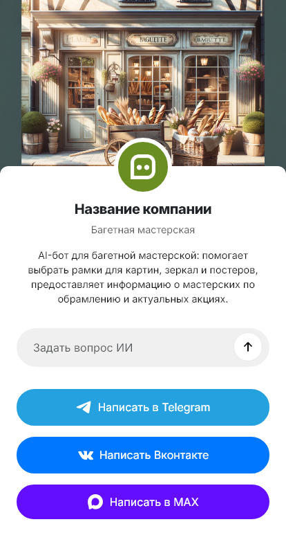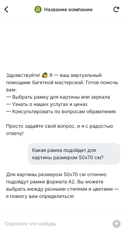 Внедрение настраивается под мастерскую: линейка багета, стекло, паспарту, услуги натяжки, сроки изготовления, правила приёма оригиналов, интеграция с CRM и уведомлениями о готовности. Бот фиксирует заказ и помогает согласовать визит в мастерскую или доставку.
