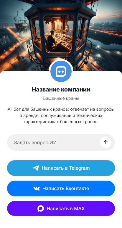 В итоге подбор башенного крана происходит без хаоса в переписке, а клиент быстрее получает подходящий вариант. Бот работает в Telegram, VK, MAX и на сайте, превращая интерес к технике в оформленный запрос и предложение.