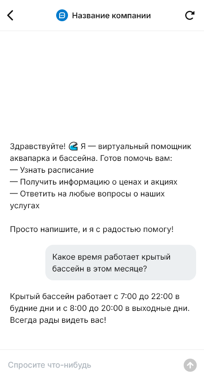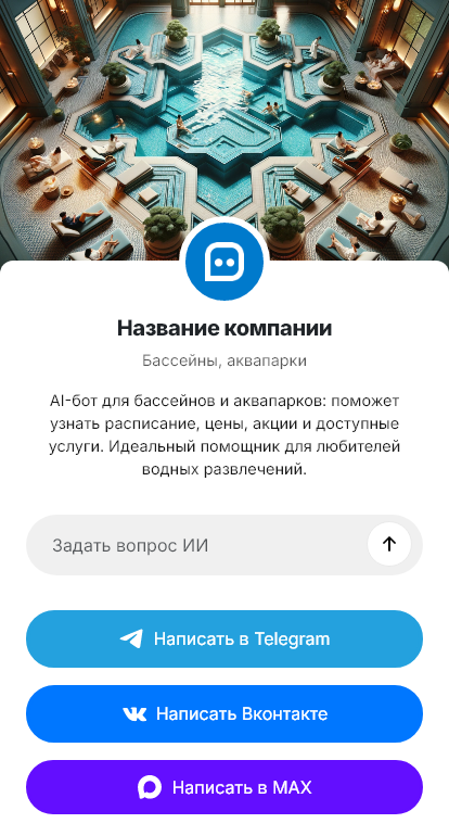 Бассейны и аквапарки — это сложный сервис с множеством нюансов: расписание сеансов, ограничения по росту и возрасту, тарифы, абонементы, аренда дорожек, тренировки, аква-зоны, сауны, правила безопасности. Посетители часто пишут в мессенджер, потому что хотят быстро понять, что работает сегодня, сколько стоит вход, как добраться и что взять с собой. Если ответы приходят поздно, люди меняют планы.