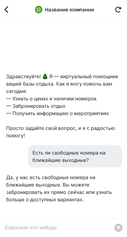 В результате растёт доля прямых броней и повышается загрузка, потому что клиенту удобно выбрать и забронировать прямо в чате. Персонал освобождается от рутины, а гости чувствуют заботу ещё до приезда, что увеличивает вероятность повторных визитов.