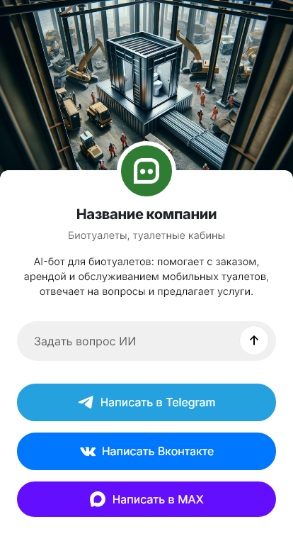 В итоге аренда биотуалетов становится предсказуемой. Клиенты получают быстрый расчёт и ясные шаги, а компания увеличивает количество заказов благодаря круглосуточному приёму заявок в Telegram, VK, MAX и на сайте.