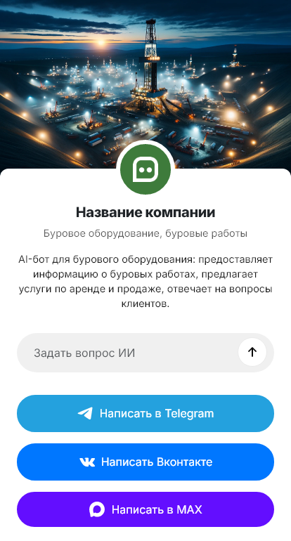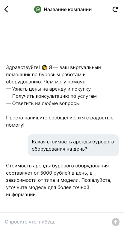 Внедрение настраивается под вашу компанию: виды работ, парк установок, тарифы, выездные зоны, интеграция с CRM и календарём выездов. Бот может назначить предварительный осмотр, зафиксировать договорённости, отправить клиенту чек-лист подготовки площадки и требования по доступу. Для корпоративных заказчиков бот собирает реквизиты и документы для договора.