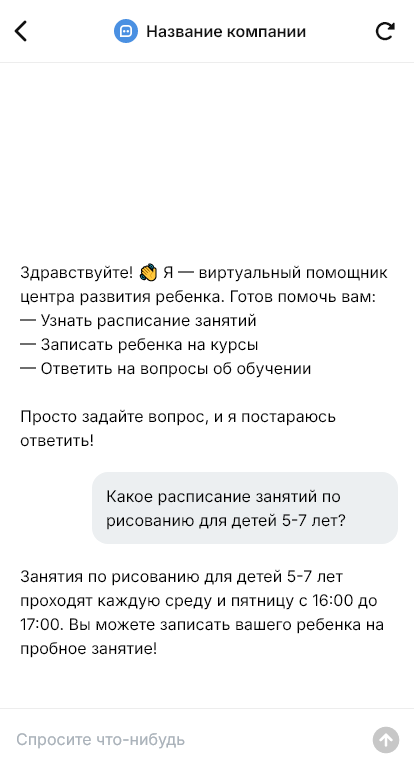 Внедрение настраивается под центр: расписание групп, преподаватели, стоимость абонементов, правила посещения и пропусков, интеграция с CRM и календарём. Бот может отправлять памятку для первого визита, список того, что взять, и напоминания, а также помогать с оплатой и продлением абонемента.