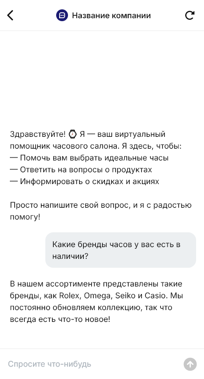 Внедрение настраивается под ассортимент и сервис: наличие моделей, варианты ремешков, гарантия, сервисное обслуживание, возможность рассрочки, правила обмена, запись на консультацию. Бот помогает не терять клиентов из рекламы и соцсетей и доводит их до визита или заказа.
