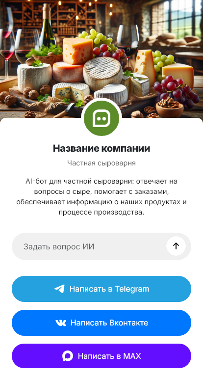 В итоге частная сыроварня получает больше заказов и сильнее удерживает клиентов. Бот работает в Telegram, VK, MAX и на сайте, превращая вопросы о сортах в оформленные покупки и регулярные заказы.