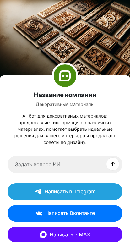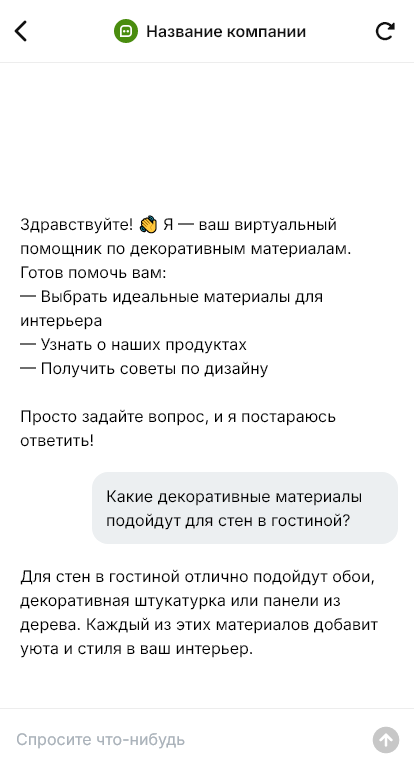 В итоге декоративные материалы покупают быстрее и спокойнее. Клиент понимает, что именно берёт и как это применять, а продавец получает больше оформленных заказов и меньше возвратов из-за неверного подбора. Коммуникация остаётся в мессенджере, где человеку привычнее решать такие задачи.