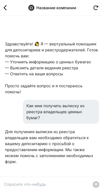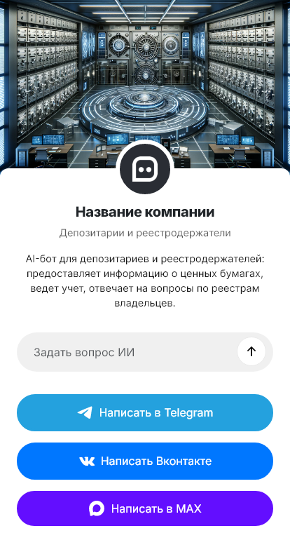 Бот для депозитария и реестродержателя помогает организовать первичную коммуникацию и маршрутизацию. Он уточняет тип клиента (физлицо/юрлицо/профучастник), тип запроса, необходимые реквизиты и документы, сроки и контактные данные. Бот может выдавать согласованные инструкции по подготовке документов и порядку обращения, а сложные кейсы передавать специалисту уже с полным контекстом.