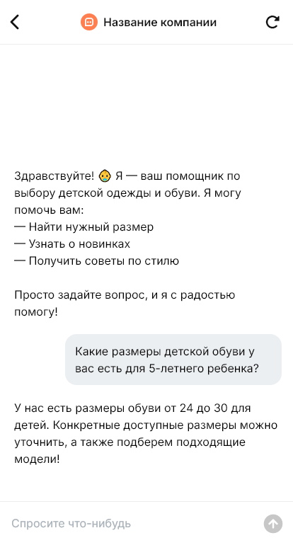 Чат-бот уточняет возраст ребёнка, рост и параметры (длина стопы, обхват груди и т.д. — по нужной категории), сезон, предпочтения по материалам и стилю, а также бюджет. По сценарию бот подсказывает, как правильно измерить ребёнка, и помогает выбрать размер по таблице. Далее бот отвечает на типовые вопросы: наличие, состав, уход, доставка, возврат, сроки и способы оплаты. Можно настроить быстрые подсказки по комплектам: «в садик», «на прогулки», «в школу», «для спорта».