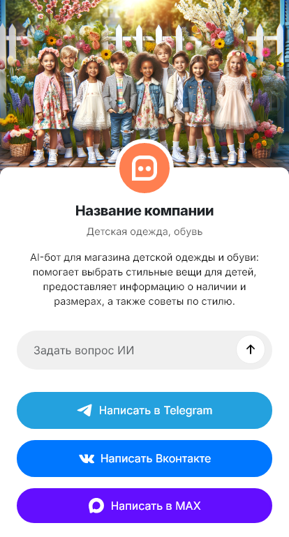 Бот работает в Telegram, ВК, MAX и на сайте 24/7, снижает нагрузку на консультантов и помогает стабильно превращать обращения в реальные заказы детской одежды и обуви.