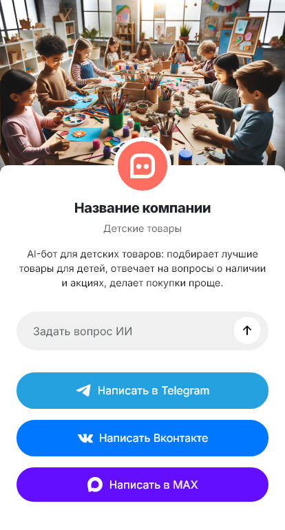 Бот работает в Telegram, ВК, MAX и на сайте 24/7, снижает нагрузку на консультантов и повышает конверсию обращений по детским товарам в реальные покупки.