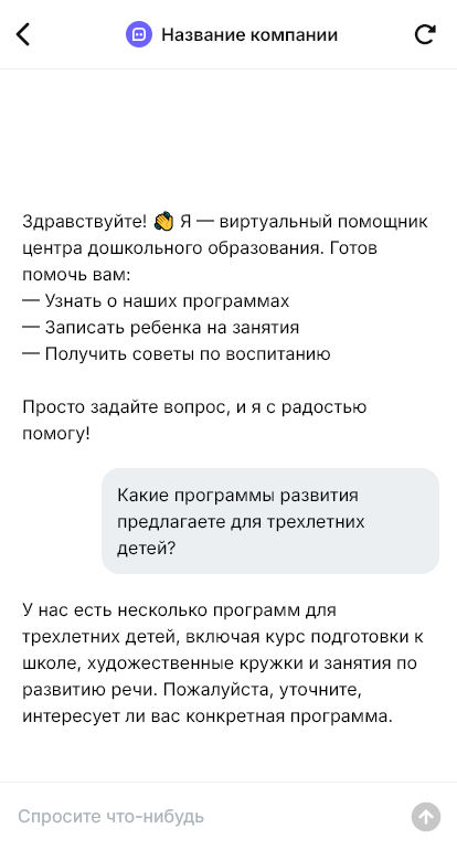 Бот для дошкольного образования помогает превратить общий запрос в конкретное решение. Он уточняет возраст, текущее развитие и особенности, цель семьи, удобный график и желаемую интенсивность. Бот может предложить несколько подходящих программ — раннее развитие, комплексные занятия, подготовка к школе, логопедические занятия, творческие студии — и объяснить, как строится работа: диагностика, план занятий, обратная связь, отслеживание прогресса.