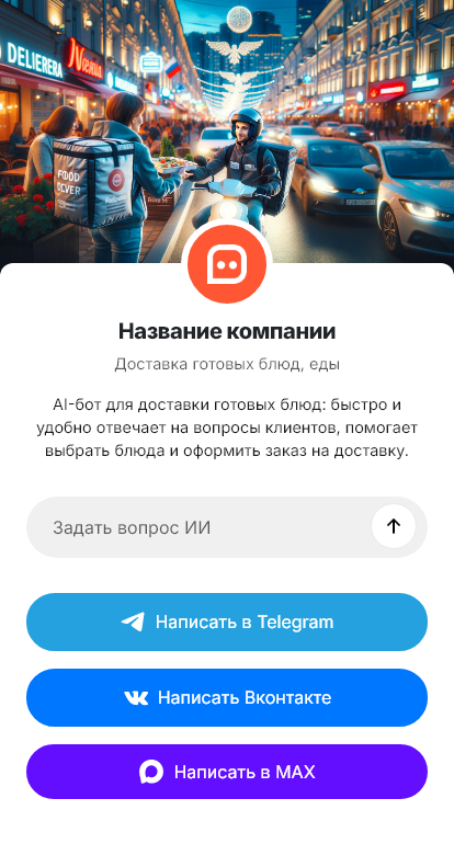 В итоге доставка готовой еды становится более предсказуемой и прибыльной. Бот работает в Telegram, VK, MAX и на сайте, превращая вопросы о меню в оформленные заказы и разгружая операторов в самые горячие часы.