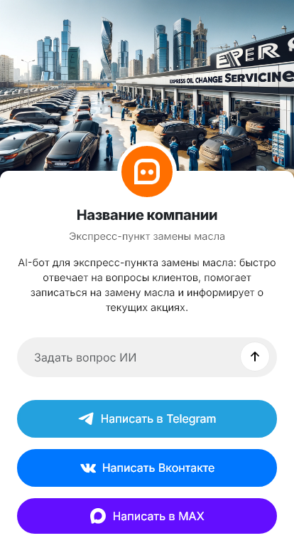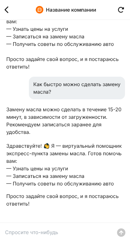 Внедрение настраивается под ваш пункт: ассортимент масел и фильтров, наличие, цены, длительность работ, расписание постов, интеграция с CRM/календарём. Бот может предлагать дополнительные услуги по регламенту: замена воздушного/салонного фильтра, проверка уровней, диагностика, а также напоминать клиенту о следующей замене по пробегу или времени.