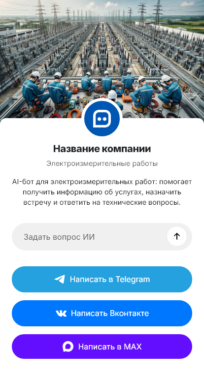 Бот работает в Telegram, ВК, MAX и на сайте 24/7, повышая скорость реакции и конверсию обращений в реальные выезды и оформленные протоколы электроизмерений.