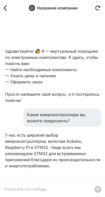 Бот для поставок электронных компонентов помогает собрать спецификацию и уточнить критические параметры. Он спрашивает, что является обязательным (корпус, напряжение, ток, частота, допуски, температурный диапазон), какие параметры допускают замену, нужен ли оригинал или допустимы аналоги, какие сроки, объёмы и условия поставки. Бот может принять файл со спецификацией и зафиксировать требования к упаковке, ESD и документам.
