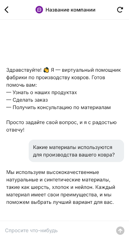 Покупка ковра — решение, которое зависит от множества нюансов: размер, материал, плотность ворса, высота, способ чистки, устойчивость к износу, цветопередача, сочетание с интерьером. Клиенты спрашивают, как ковёр поведёт себя с детьми и животными, насколько легко чистится, не скользит ли, подойдёт ли для тёплого пола, есть ли индивидуальные размеры и сроки производства. Если фабрика или магазин отвечает медленно, диалог затухает, потому что клиент параллельно рассматривает десятки вариантов.