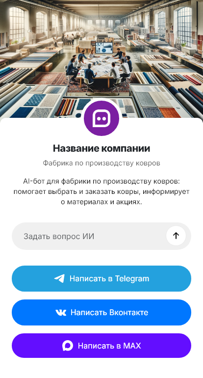 Бот для фабрики по производству ковров помогает начать консультацию сразу и структурировать выбор. Он уточняет тип помещения, желаемый размер и форму, предпочтения по материалу и фактуре, цветовую гамму, бюджет и сроки. Бот может предложить варианты коллекций, объяснить разницу материалов и технологий, подсказать уход и условия эксплуатации, а затем перевести клиента к заказу, заявке на расчёт индивидуального размера или записи в шоурум.