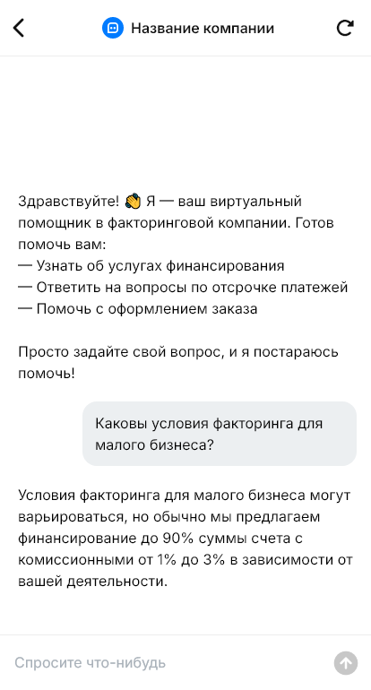 Факторинговые компании получают обращения от бизнеса: условия финансирования, требования к дебиторам, документы, лимиты, сроки, интеграции и порядок рассмотрения. Если ответ задерживается, клиент идёт к конкурентам. Бот для факторинговой компании помогает автоматизировать первичный диалог и собрать вводные для расчёта.