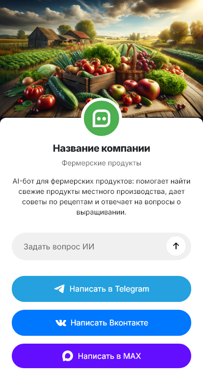 В итоге фермерские продукты продаются стабильнее, а сервис становится современным. Бот работает в Telegram, VK, MAX и на сайте, превращая вопросы о качестве в оформленные заказы и увеличивая выручку без расширения штата.