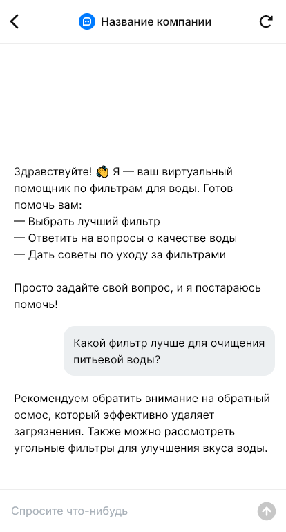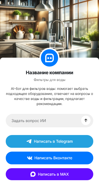 Чат-бот уточняет условия: тип воды, количество людей, нужна ли защита от накипи/хлора/железа, формат установки (кувшин, проточный, обратный осмос), а также бюджет. Затем предлагает подходящие модели и расходники, даёт ориентир по стоимости, объясняет обслуживание и помогает оформить доставку или заявку на установку.