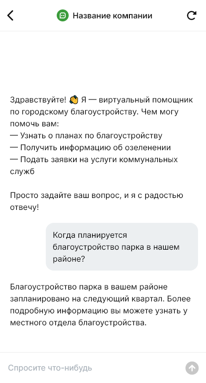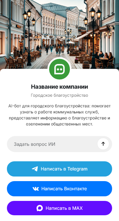 Бот работает в Telegram, ВК, MAX и на сайте 24/7, повышает скорость обработки обращений, снижает нагрузку на диспетчерскую и увеличивает конверсию заявок в реальные проекты по благоустройству.