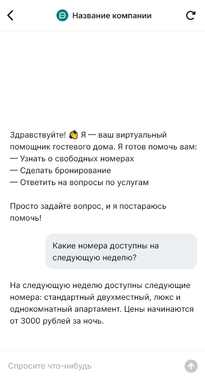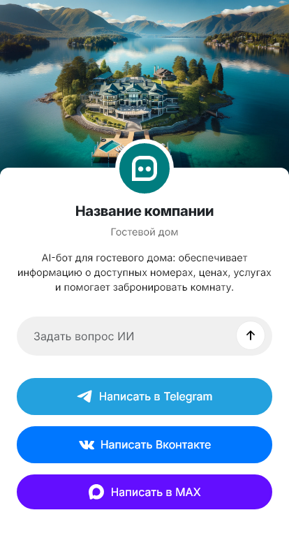 Внедрение настраивается под конкретный гостевой дом: описание номеров, фотографии, правила заселения, предоплата, сезонные цены, интеграция с календарём и CRM. Бот отправляет инструкции по заезду и может сопровождать гостя во время проживания: отвечать на вопросы, давать рекомендации по местам рядом.