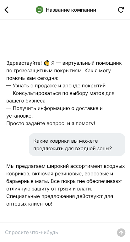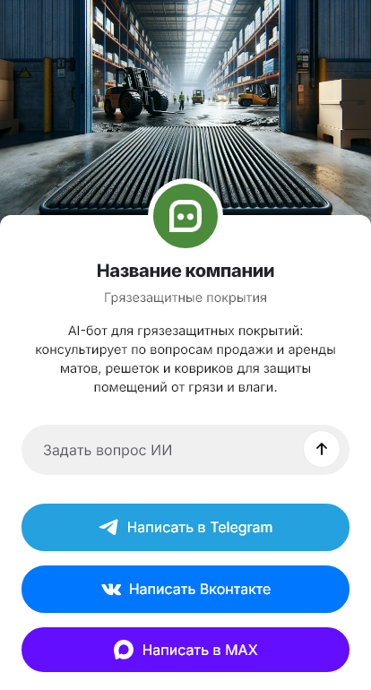 Бот помогает быстро подобрать решение. Он уточняет тип объекта, число входов, примерную проходимость, наличие тамбура, ширину дверей, глубину входной зоны и требования к внешнему виду. Клиент может прикрепить фото и план, а бот предложит подходящие варианты, решётки, модульные покрытия, ковры, зоны очистки, и сформирует заявку на расчёт или выезд. Он также объясняет логику системной грязезащиты, зачем нужны разные уровни, чтобы клиент понимал, почему одно покрытие может не справиться в одиночку.