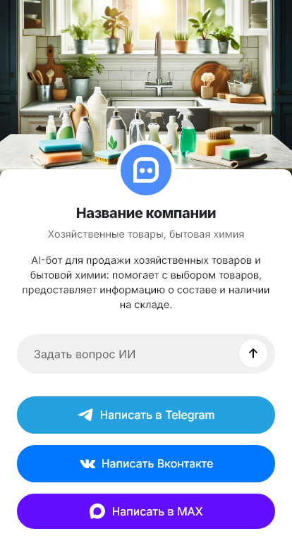 Бот работает в Telegram, ВК, MAX и на сайте 24/7, снижает нагрузку на консультантов и повышает продажи хозяйственных товаров и бытовой химии.