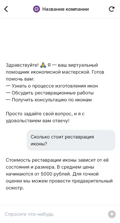Внедрение настраивается под мастерскую: каталог образов, ориентиры по срокам, этапы работы (эскиз, согласование, написание, покрытие), условия предоплаты, доставка и упаковка, интеграция с CRM. Бот фиксирует заявку аккуратно и структурированно, чтобы мастер понимал все нюансы и мог дать точную оценку.