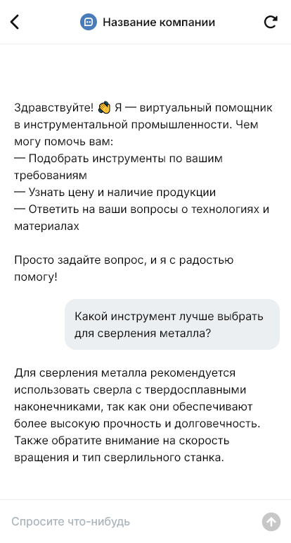 В итоге инструмент закупают быстрее и точнее, сокращаются простои и брак, а поставщик получает более стабильные повторные продажи благодаря боту.