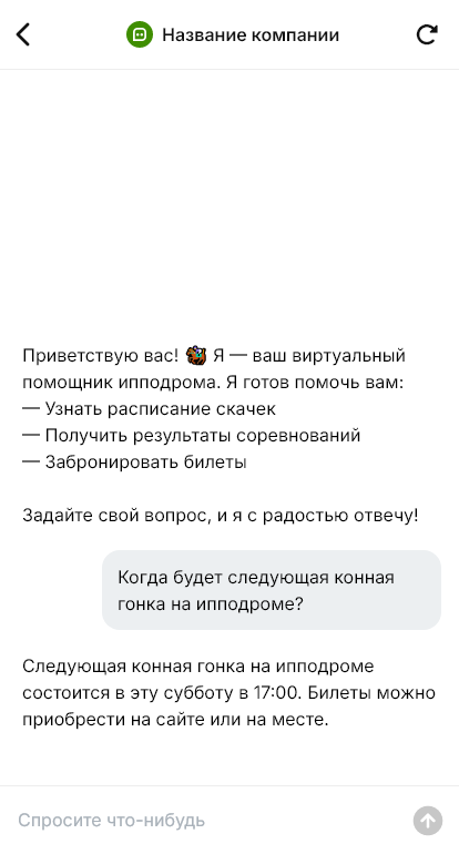 Ипподром — это и спортивные события, и досуг, и сервисы, которые нужно координировать. Люди спрашивают про расписание забегов, билеты, экскурсии, катание, обучение, аренду лошади, правила посещения, парковку и инфраструктуру. В дни мероприятий поток обращений растёт, и если ответы дают вручную, часть гостей не получает информацию вовремя и просто не приезжает.