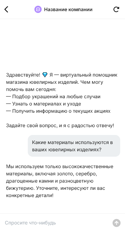 Чат-бот уточняет тип изделия, стиль, цвет металла, наличие камней, предпочтения по минимализму или яркому дизайну, бюджет и сроки. По сценарию бот помогает определить размер кольца, подобрать длину цепочки/браслета, объясняет особенности покрытия и ухода. Также бот может предлагать готовые наборы, комплементарные изделия и варианты подарочной упаковки — особенно полезно, когда клиент выбирает подарок и не хочет долго думать.