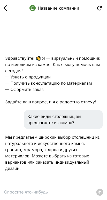 Чат-бот уточняет тип изделия, размеры, материал, обработку кромки, сроки, адрес, собирает контакты и передаёт заявку менеджеру/замерщику. Также бот может отправлять примеры работ и варианты камня.