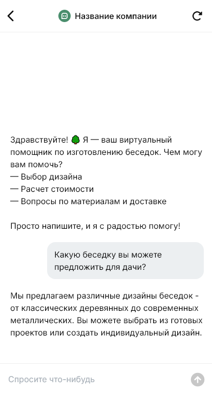 В итоге изготовление беседок становится управляемым сервисом. Бот работает в Telegram, VK, MAX и на сайте, ускоряет сбор вводных, повышает точность расчёта и помогает довести клиента от идеи до готовой беседки, которая подходит участку и сценариям отдыха.