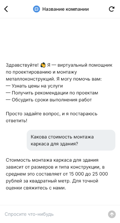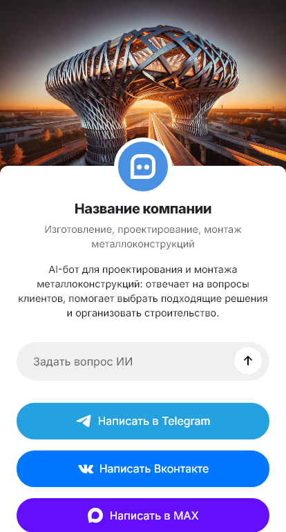 Бот помогает собрать требования и подготовить входные данные для инженера и сметчика. Он уточняет тип конструкции и назначение, размеры и объёмы, наличие проекта или КМ/КМД, требования по нагрузкам и регионам, сроки, условия площадки, необходимость монтажа и техники, документы и формат закупки. Бот может запросить чертежи, спецификации и фотографии площадки, чтобы оценка была точной и быстрой.