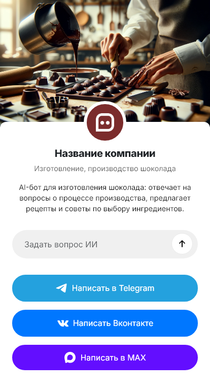 В итоге шоколад продаётся стабильнее, а процесс заказа становится прозрачным и удобным. Бот работает в Telegram, VK, MAX и на сайте, превращая вопросы о составе и упаковке в подтверждённые заказы.