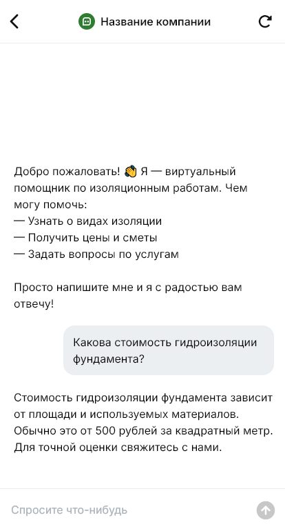 Внедрение выполняется под вашу специализацию: используемые материалы и технологии, прайс-логика, сезонность, география выездов, гарантия и сервис. Можно настроить отдельные ветки для частных домов, квартир и коммерческих объектов, а также сценарий «срочно устранить протечки/конденсат» с приоритетной обработкой.
