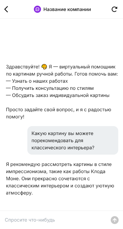 Картины ручной работы и живопись — это эмоциональная покупка, но при этом клиенту важна уверенность: подойдёт ли размер, как будет смотреться в интерьере, какие цвета сочетаются, можно ли сделать в другой палитре, как оформлять в багет, как безопасно доставить, какие сроки у индивидуального заказа. Если художник или галерея отвечает долго, эмоция покупки исчезает, и клиент откладывает решение.