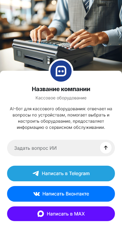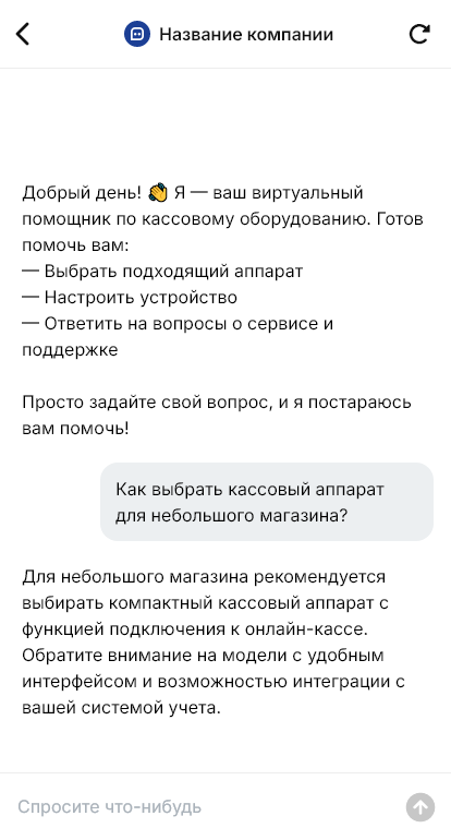 Внедрение настраивается под ваш бизнес: каталоги оборудования, наличие, тарифы на обслуживание, интеграции, сценарии «под ключ». Бот может оформлять заявку на консультацию, выставление счёта и доставку, а также собирать реквизиты для договора. Для действующих клиентов бот помогает продлевать ОФД, менять ФН, планировать сервис и решать типовые вопросы поддержки.