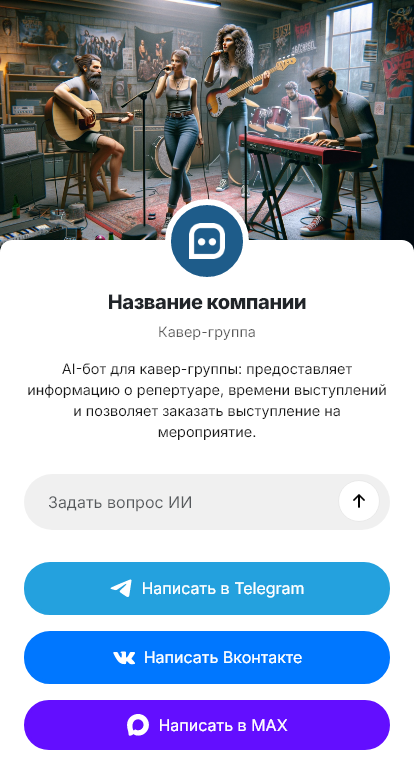 Бот для кавер-группы помогает собрать заявку и предложить подходящий формат. Он уточняет дату и город, площадку, количество гостей, формат события, возраст аудитории, длительность и количество сетов, предпочтения по стилю, пожелания по хитам и запретные треки, наличие сцены и звука, бюджет и контакты. Бот может отправить портфолио, видео с выступлений, варианты составов и пакеты «лайт/стандарт/расширенный».