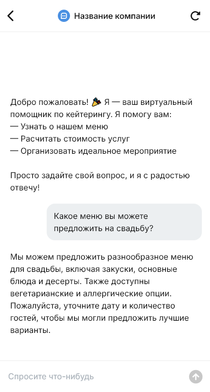 Внедрение настраивается под процессы компании: пакеты меню, сезонные предложения, минимальные суммы заказа, логистика и тайминги выездов, правила предоплаты и договоров, работа с юрлицами, интеграция с CRM. Бот помогает объяснить, из чего складывается стоимость, и сразу собирать те данные, без которых невозможно подготовить смету.