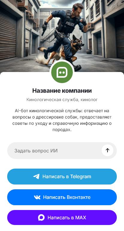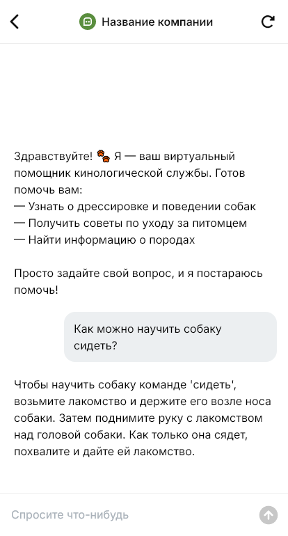 Внедрение настраивается под подход специалиста: направления (щенки, коррекция поведения, послушание, спортивная дрессировка), правила записи, стоимость и длительность, место занятий, подготовка к первому занятию. Бот помогает заранее объяснить, как будет строиться работа и какие ожидания реалистичны, что повышает доверие.