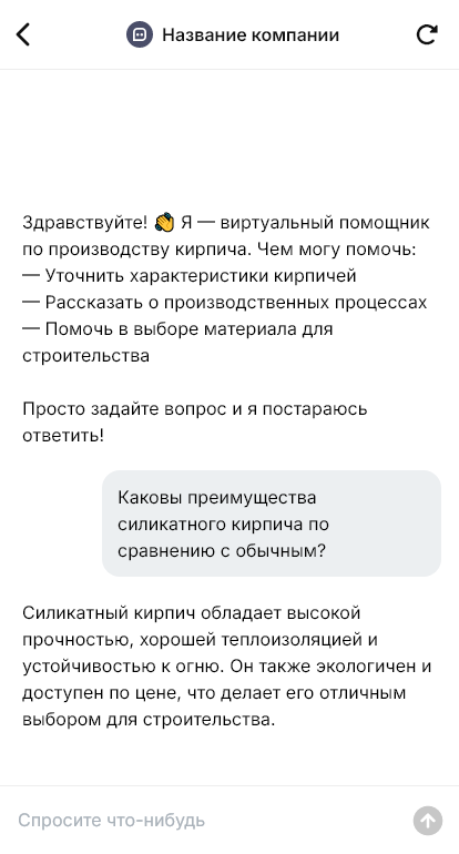 Бот помогает провести клиента через выбор без перегрузки техническими терминами. Он уточняет, для чего нужен кирпич, стены, перегородки, облицовка, хозяйственные постройки, и в каком климате будет объект. Уточняет влажность, требования к морозостойкости и прочности, наличие утепления и тип кладки. Затем предлагает подходящие варианты и объясняет, почему они подходят, где силикатный будет практичен, а где лучше выбрать другой материал.