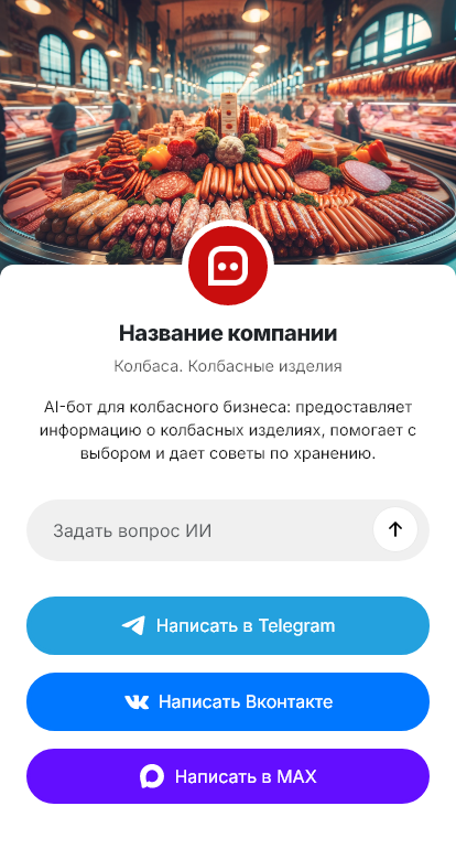 В итоге колбасные изделия продаются стабильнее, а сервис становится удобнее. Бот работает в Telegram, VK, MAX и на сайте, превращая вопросы о составе в оформленные заказы и увеличивая выручку без расширения команды.