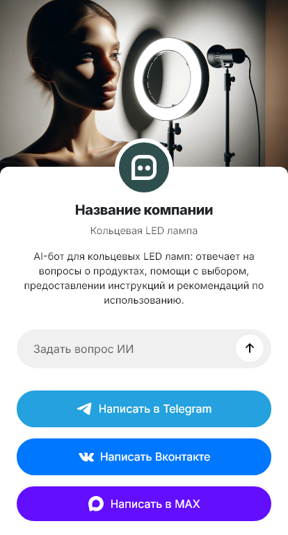 Бот для продажи кольцевых ламп помогает выбрать модель под задачу. Он уточняет, для чего нужна лампа (макияж, видео, фото, работа мастера), расстояние до лица/объекта, нужна ли мобильность, какая высота штатива требуется, нужен ли держатель для телефона или камеры, важны ли управление с пульта, питание от сети/USB и возможность использования на выезде.