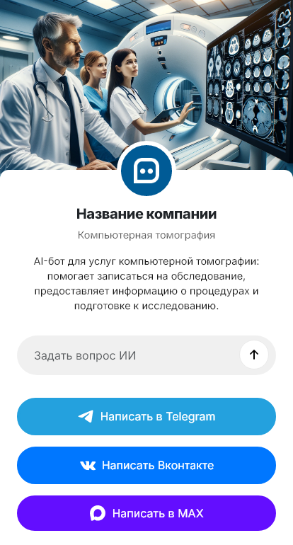 В итоге запись на КТ становится быстрее и точнее, а центр получает меньше ошибок и пропусков. Бот работает в Telegram, VK, MAX и на сайте, превращая вопросы о КТ в подтверждённые визиты.