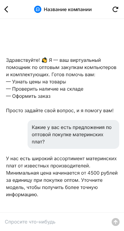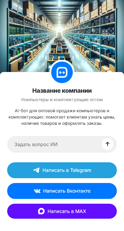 Чат-бот уточняет интересующие категории (ПК, ноутбуки, комплектующие), бренды и модели, объёмы и сроки, регион доставки, собирает контакты и реквизиты и передаёт заявку менеджеру. Для типовых вопросов бот выдаёт справочную информацию по гарантиям, доставке и условиям работы.