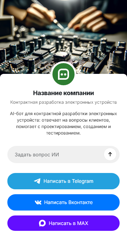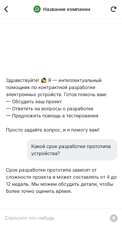 Внедрение настраивается под ваш процесс: этапы R&D, прототипирование, разработка платы, прошивка, тестирование, подготовка к производству, сопровождение серии. Бот интегрируется с CRM и фиксирует статус: получены требования, нужна NDA, назначен созвон, подготовлена оценка. Он может автоматически собирать реквизиты, отправлять шаблон NDA и план работ, чтобы заказчик понимал путь проекта.