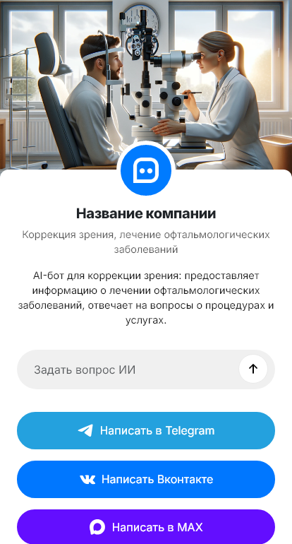 В итоге клиника получает больше подтверждённых визитов и меньше потерь на этапе первого контакта. Бот работает в Telegram, VK, MAX и на сайте, превращая вопросы о коррекции зрения в запись на диагностику.