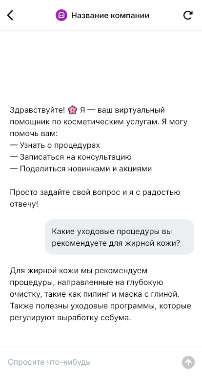 - уточняет тип кожи и цель (увлажнение, чистка, лифтинг)